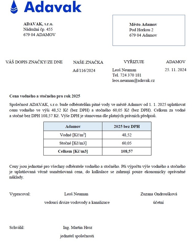 Uvnitř článku naleznete ceny vodného a stočného ve městě Adamov pro období roku 2025.