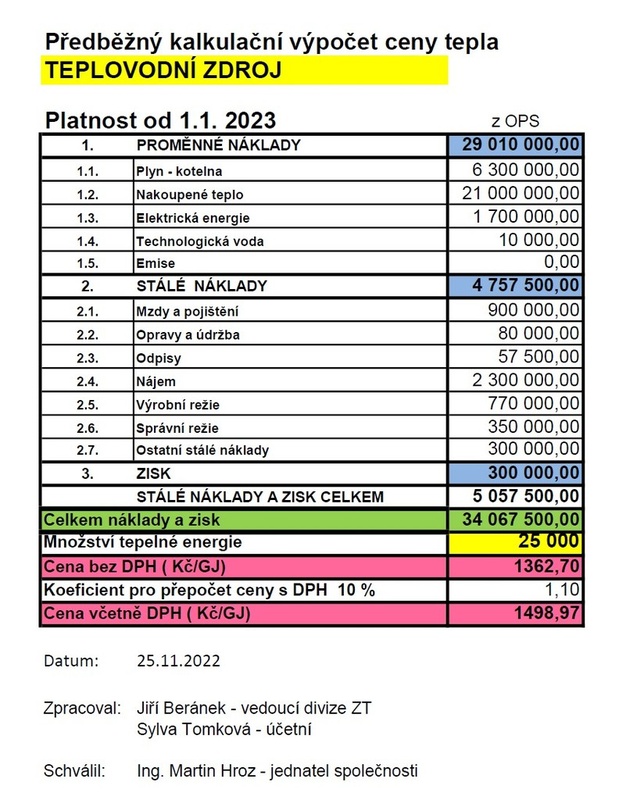 Uvnitř článku naleznete předběžný kalkulační vypočet ceny tepla platný pro teplovodní zdroj od 1. ledna 2023.