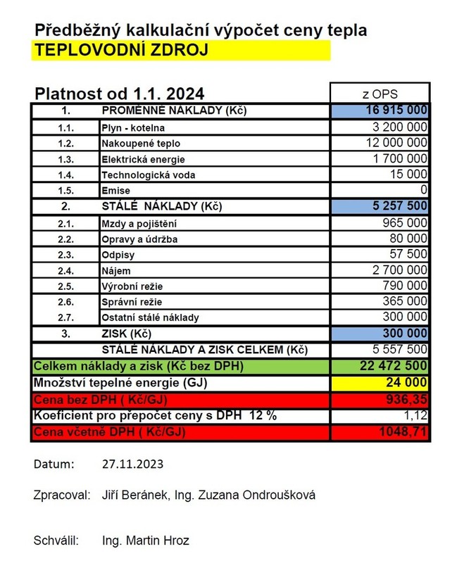 Uvnitř článku naleznete předběžný kalkulační vypočet ceny tepla platný pro teplovodní zdroj od 1. ledna 2024.