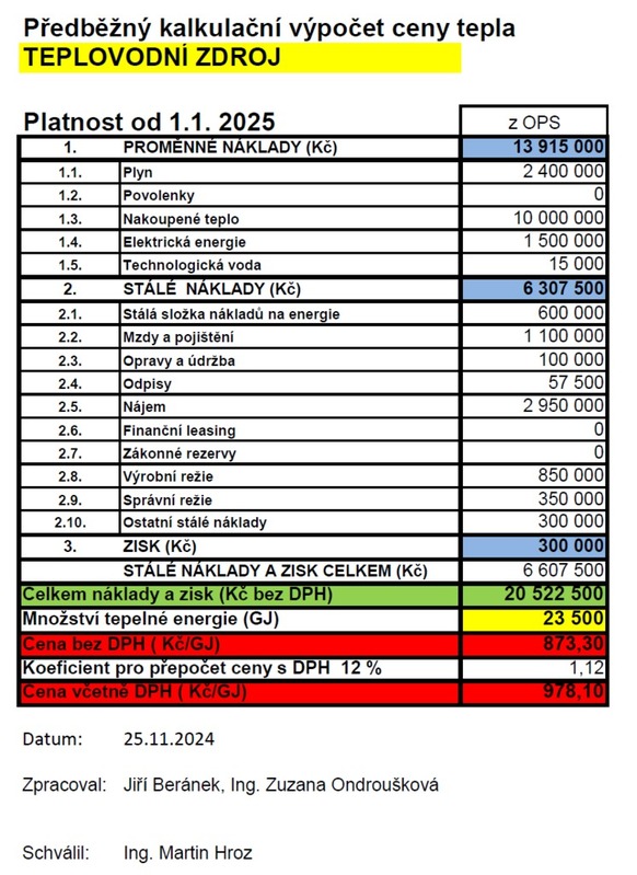 Uvnitř článku naleznete předběžný kalkulační vypočet ceny tepla platný pro teplovodní zdroj od 1. ledna 2025.
