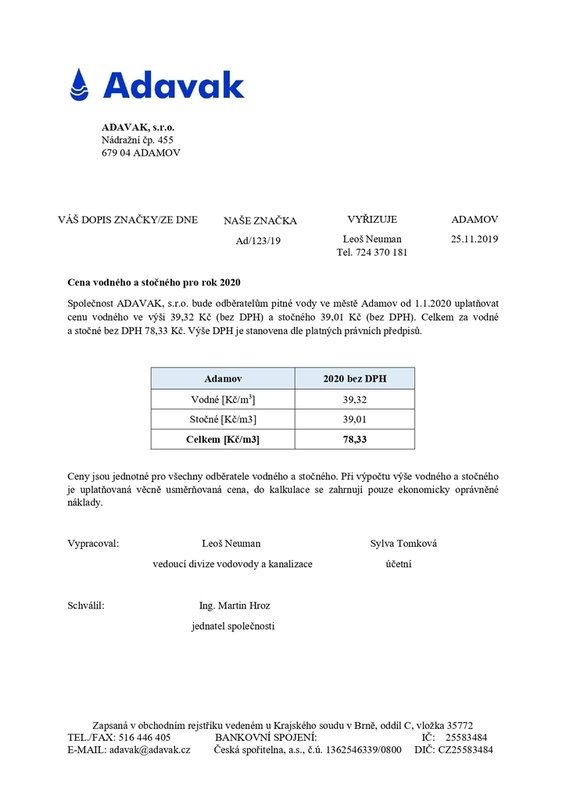 » Cena vodného a stočného pro rok 2020